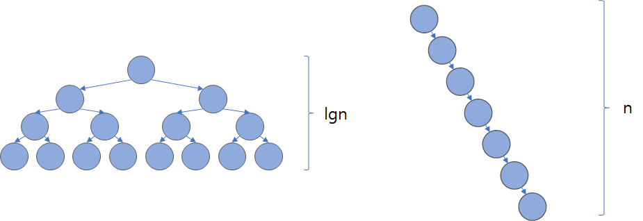 BST์์๋ ๋ ธ๋์ ๊ฐฏ์(์์์ ๊ฐฏ์)๊ฐ n์ด๋ผ๊ณ ํ ๋, ํธ๋ฆฌ์ ๋์ด h๋ ์ต์ lgn, ์ต๋ n์ด๋ค. ์์ ์ด์ง ํธ๋ฆฌ์ ํํ๋ฅผ ๋๊ณ ์์ ๋ lgn์ด ๋๊ณ , ํ ์ชฝ์ผ๋ก ์น์ฐ์น ํํ์ ํธ๋ฆฌ๋ n์ ๋์ด๊น์ง ๊ฐ์ง ์ ์๋ค.