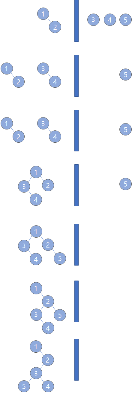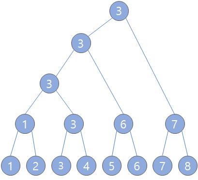 ํ ๋๋จผํธ ํธ๋ฆฌ๋ ์์ ๊ทธ๋ฆผ์ฒ๋ผ, ๋ฆฌํ๋ ธ๋๋ถํฐ ๋๊ฐ์ฉ ๋น๊ตํด์ ๋ ํฐ ์์๊ฐ ์๋ก ์ฌ๋ผ๊ฐ๋ ๊ตฌ์กฐ์ด๋ค.