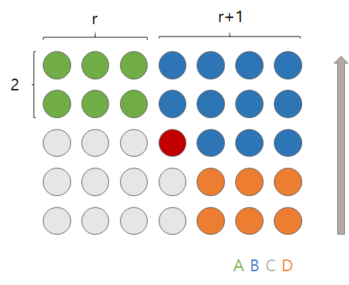 A+D ์งํฉ์ ํฌ๊ธฐ๋ ์์ ๊ทธ๋ฆผ์์ 4r์ด๋ฏ๋ก ์๊ฐ๋ณต์ก๋๋ 4r์ด๋ค. n์ 5(2r+1)์ด๋ค.