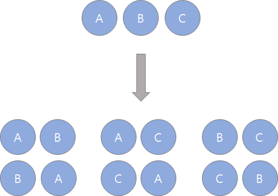 ์์ด์ ์ค๋ณต์์ด n๊ฐ ์ค r๊ฐ๋ฅผ ๋ฝ์ ์์๋ฅผ ์ ํด ๋์ดํ๋ ๊ฒฝ์ฐ์ด๋ค. ์์ ๊ทธ๋ฆผ์ฒ๋ผ A, B, C ์ธ๊ฐ์ง ์์๊ฐ ์์ ๋, 2๊ฐ๋ฅผ ๋ฝ์ ์์๋ฅผ ์ ํ๋ ๊ฒ์ 3P2๋ผ๊ณ ํ๋ค. ์๋์ ๊ฐ์ ๊ฒฝ์ฐ์ ์๊ฐ ๋์ค๋ฏ๋ก ์ด 6๊ฐ์ง ์ด๋ค.