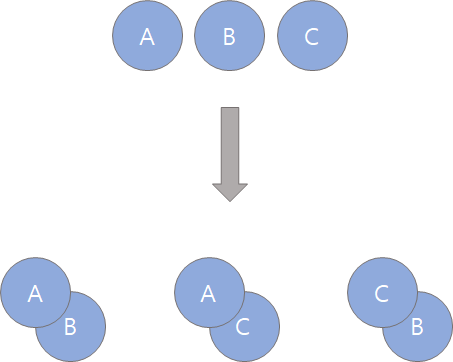 ์กฐํฉ์ ์ค๋ณต์์ด n๊ฐ ์ค r๊ฐ๋ฅผ ์์์ ์๊ด์์ด ๋ฝ๋ ๊ฒฝ์ฐ์ด๋ค. ์์ ๊ทธ๋ฆผ์ฒ๋ผ A, B, C ์ธ๊ฐ์ง ์์๊ฐ ์์ ๋, 2๊ฐ๋ฅผ ์์์ ์๊ด์์ด ๋ฝ๋ ๊ฒ์3C2๋ผ๊ณ ํ๋ค. ์๋์ ๊ฐ์ ๊ฒฝ์ฐ์ ์๊ฐ ๋์ค๋ฏ๋ก ์ด 3๊ฐ์ง์ด๋ค.