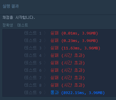 ใ ใ .. ์ ์๋๋์ง ๋ชจ๋ฅด๊ฒ ๋ค. ์๊ฐ ์ด๊ณผ๊ฐ ๋ฌธ์ ๋ผ๋ฉด ์์ ํ ์คํธ 1,2,3์ ๋ง์์ผํ๋๋ฐ ๊ทธ๊ฒ๋ ํ๋ ธ๋ค. ๊ทผ๋ฐ ๋ 9๋ฒ์ ํต๊ณผ ใ ใ ใ ..?