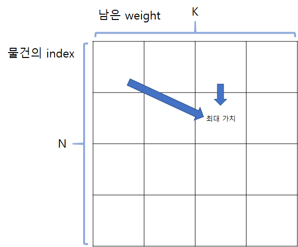 // ์์ ํ์์ผ๋ก ํ๋ค๋ฉด ์ฃผ์ด์ง ๋ฌผ๊ฑด๋ค์ ์กฐํฉํด์ ๋ฌด๊ฒ๊ฐ K ์ดํ์ธ ์กฐํฉ๋ค ์ค ๊ฐ์น๊ฐ ๊ฐ์ฅ ๋์ ๊ฒฝ์ฐ๋ฅผ ์ฐพ๊ธฐ