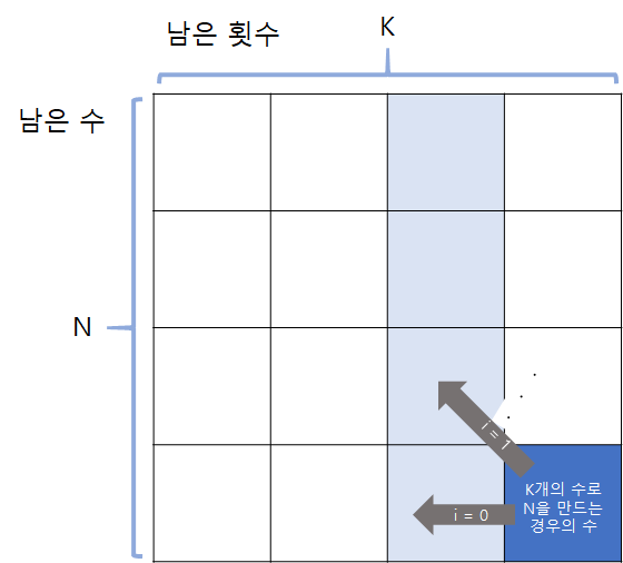 - DP : N, K๋ฅผ ํ, ์ด๋ก ํ๊ณ ๊ฐ์ด ๊ฒฝ์ฐ์ ์์ธ 2์ฐจ์ ๋ฐฐ์ด ํํ