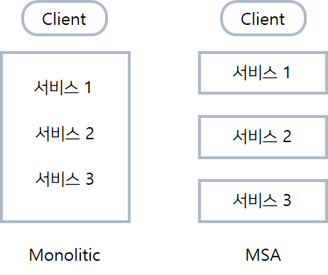 ๊ธฐ์กด์ ์ํคํ ์ฒ๋ Monolitic ์ํคํ ์ฒ๋ก ํ๋์ ์ฝ๋ ๋ฒ ์ด์ค์ ํ๋์ ๋ฐฐํฌ ์ฃผ๊ธฐ๋ฅผ ๊ฐ์ง๊ณ ์๋ ์ํคํ ์ฒ๋ฅผ ๋ปํ๋ค. ์๋น์ค ๋ณ๋ก ๋๋์ด์ ธ์์ง ์์ผ๋ฉฐ ํ๋์ ์๋น์ค๋ฅผ ๊ฐฑ์ ํ์ฌ ๋ฐฐํฌํ๊ณ ์ ํ๋ฉด ๋ชจ๋ ์๋น์ค๊ฐ ๋ค์ ๋ฐฐํฌ ๋๋ค.