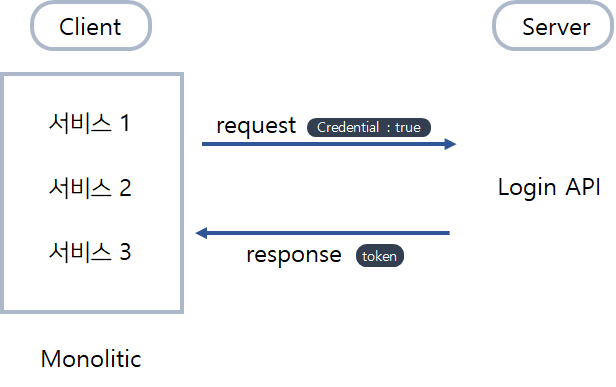 Client는 Login API를 통해 token을 얻어 저장하고 있으며, API 호출 시마다 저장된 Token을 사용하게 된다. 해당 token은 모든 서비스가 함께 이용한다.