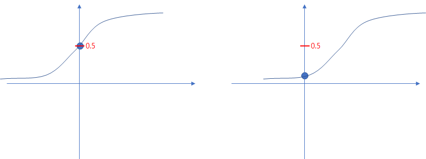 ์ผ์ชฝ ๊ธฐ์กด์ sigmoid ํจ์์์ (0,0) ์ ๋ ฅ์ ์ถ๋ ฅ๊ฐ์ ํญ์ 0.5์ด๋ค. ์ฌ๊ธฐ์ theta ๊ฐ๋ ์ ์ถ๊ฐํ์ฌ ์ค๋ฅธ์ชฝ ๊ทธ๋ฆผ์ฒ๋ผ sigmoid ํจ์๋ฅผ ์ด๋์ํค๋ฉด 0.5๊ฐ ์๋ ๋ค๋ฅธ ๊ฐ์ด ๋์ฌ ์ ์๋ค.
