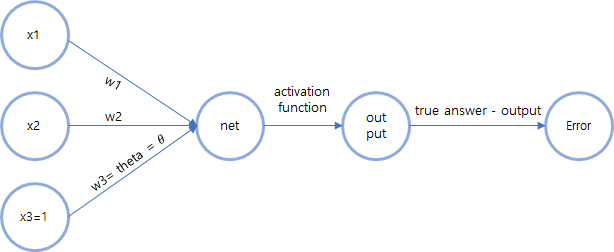 net = x1*w1 + x2*x2 + theta , O = f(net) = f(theta) ์ด๋ฏ๋ก theta ๋งํผ ๊ทธ๋ํ๋ฅผ net์ถ์ผ๋ก ์ด๋ํ ๊ฒ์ฒ๋ผ ์๊ฐํ ์ ์๋ค.
