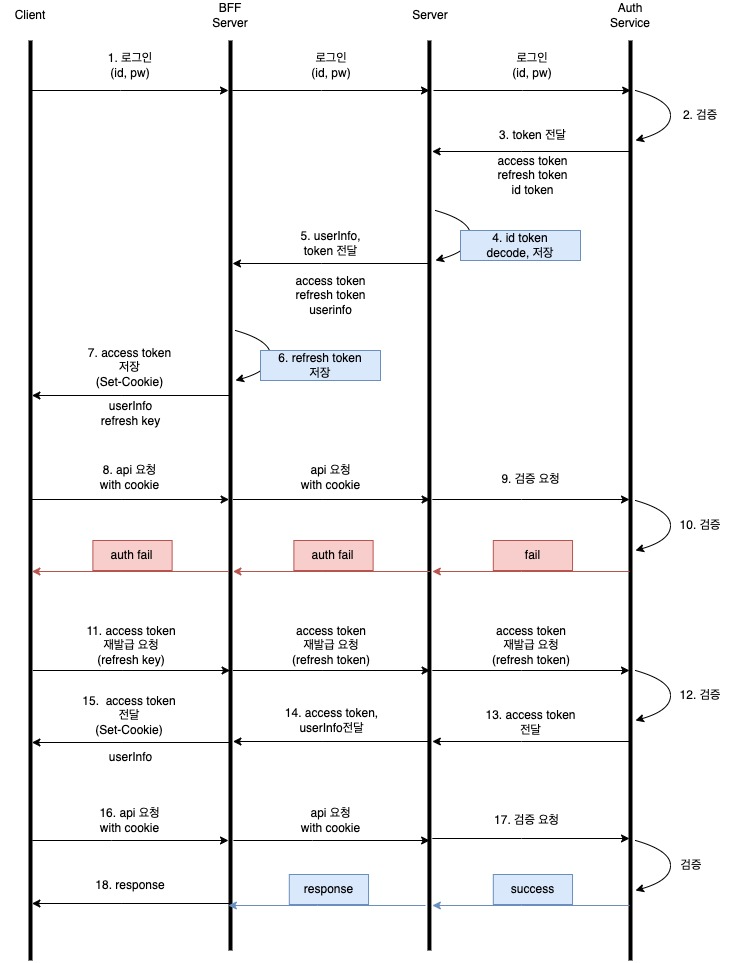 access token์ด ์๋ cookie์ ํจ๊ป ๋ณด๋ ๋๋ค. ์์ฒญ์ BFF Server๋ฅผ ๊ฑฐ์ณ Server๋ก ๊ฐ๋๋ค. - Server์์๋ Auth Service์