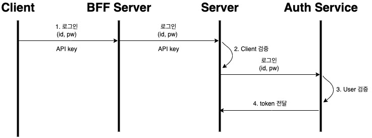 - Client가 id(username)와 password를 입력하고 가지고 있던 API key를 넘겨 로그인합니다. 로그인 요청은 BFF → Server → Auth Service로 전해집니다. Server에서는 유효한 Client인지 API Key를 가지고 검증합니다.
