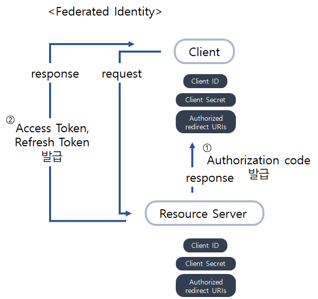 - 토큰 발급 : Client가 Authorization code를 이용하여 Resource Server로부터 토큰 발급