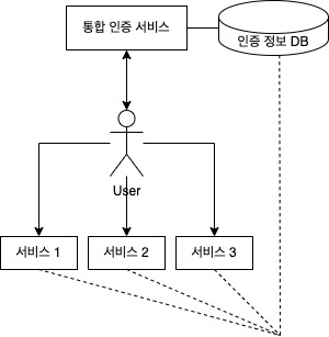 ๊ฐ ์๋น์ค์ ์ ๊ทผํ ๋ ์ด์ ๋ ์ด์ด์ ํตํฉ ์ธ์ฆ ์๋น์ค๊ฐ ์กด์ฌํ๋ ๋ฐฉ์์ ๋๋ค. User๋ SessionID๋ฅผ ๊ฐ์ง๊ณ ์๊ณ ํตํฉ ์ธ์ฆ ์๋น์ค๋ฅผ ํต๊ณผํ๋ฉด ํด๋น ์๋น์ค๋ฅผ ์ด์ฉํ ์ ์์ต๋๋ค. ์ด ๋ฐฉ์์ ๋จ์ ์ ๊ฐ ์๋น์ค๋ฅผ ์ด์ฉํ ๋๋ง๋ค ์ธ์ฆ ๊ณผ์ ์ ๊ฑฐ์ณ์ผ ํ๋ฉฐ ์ธ์ฆ ์๋น์ค ์์ฒด๊ฐ bottle neck์ด ๋ ์ ์๋ค๋ ๊ฒ์ ๋๋ค.