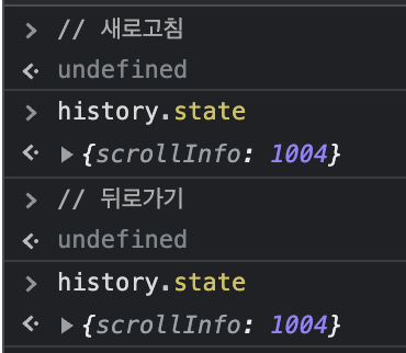 ๊ฒฐ๊ตญ ์๋ก๊ณ ์นจ์ด๋ ๋ค๋ก๊ฐ๊ธฐ์ ๊ฐ์ด ์ง๊ธ A ํ์ด์ง๋ฅผ ๋ณด๋ ์ค ๋ค๋ฅธ ๊ณณ์ ๊ฐ๋ค๊ฐ ๋๋์์๋ค๋ ๊ฒ์ด ๋ณด์ฅ๋์ด์ผ ์ ์ฅ๋ ์คํฌ๋กค ์์น๋ฅผ ๋ฐ์์ ์ด๋ํด์ผ ํฉ๋๋ค. ์ด ๊ตฌํ์ history API์ ์ฐ๊ฒฐ๋์ด ์๋๋ฐ, ์๋์ ๊ฐ์ด history API์ pushState ํจ์๋ฅผ ์ด์ฉํด state๋ฅผ ์ง์ด๋ฃ์ผ๋ฉด (1. ์๋ก๊ณ ์นจ / 2. ๋ค๋ก๊ฐ๊ธฐ) ์์๋ state๊ฐ ์ ์ง๋๊ณ (3. url ์ ๋ ฅ ์ ์ ์)์๋ state๊ฐ ๋ ์๊ฐ ๋ฒ๋ฆผ์ ์ ์ ์์ต๋๋ค. ์ด๋ฅผ ์ด์ฉํ์ฌ ์ด์ ์ ์์ฑํ id์ ๊ฐ์ ํ์ด์ง์ธ์ง ํ๋จํ์ฌ uniqueId๋ฅผ ์์ฑํ๋ ํจ์๋ฅผ ๊ฐ๋ฐํ๋ฉด ๋ฉ๋๋ค.