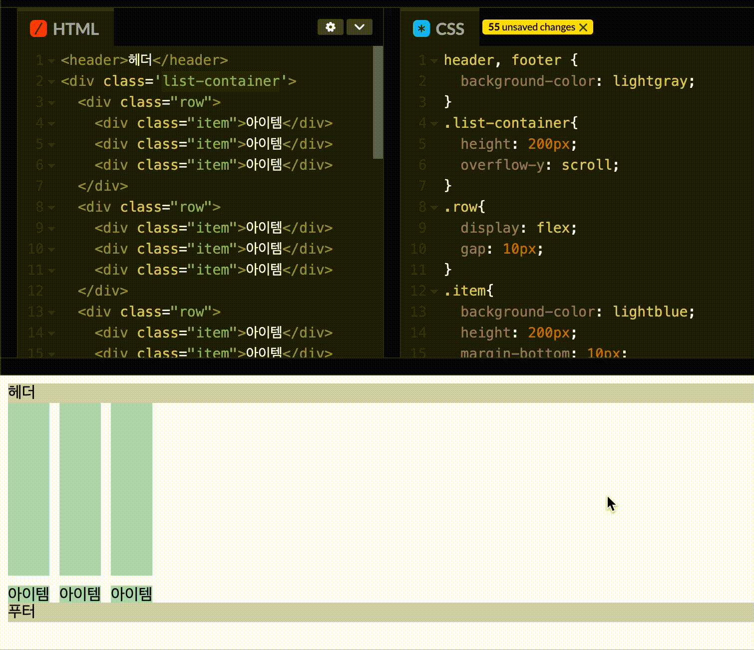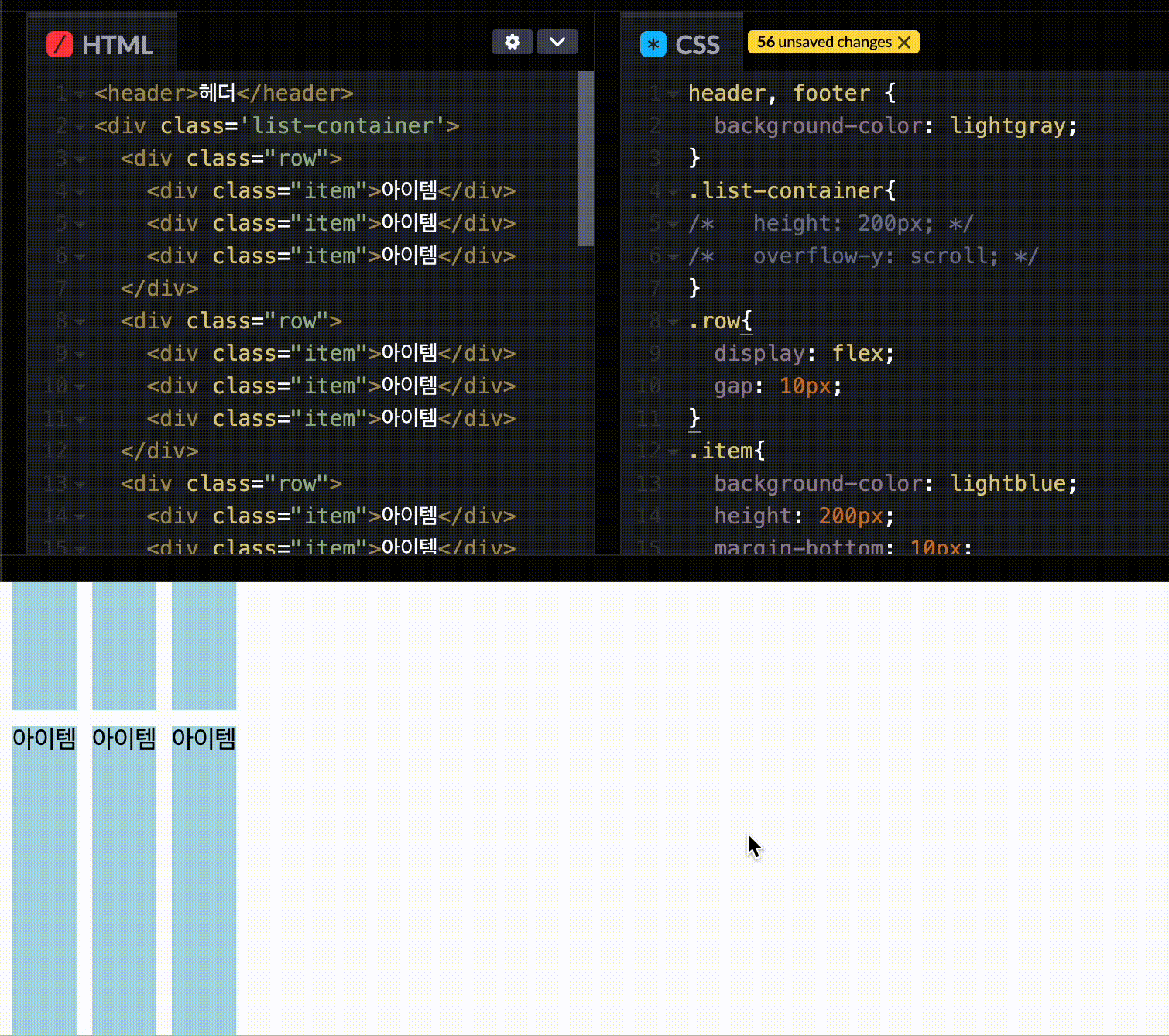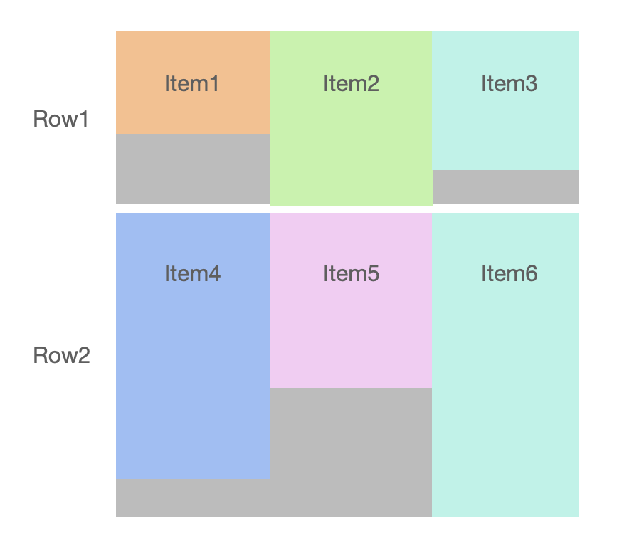 - ํ Row์์ row์ ๋์ด๋ row์ ์ํ item ์ค ๊ฐ์ฅ ํฐ ๋์ด์ ๋ง์ถฐ ์กฐ์ ๋๋ค.