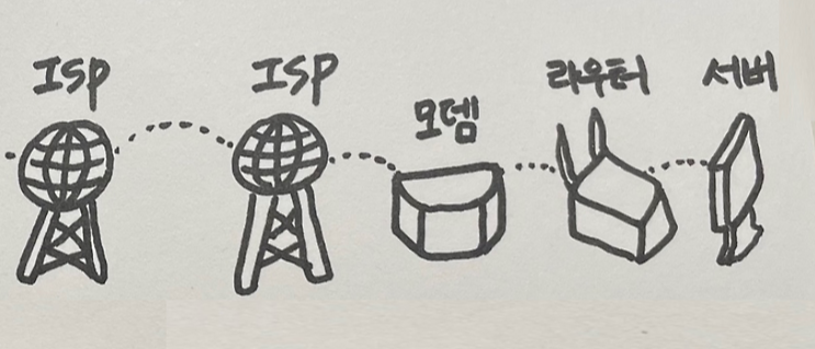 ์ผ์ด๋ธ์ ํตํด ์ด๋ํ ์ ํธ๊ฐ ์ ๋ฌ๋๋ ISP(Internet service provider)๋ ์ฝ๊ฒ ๋งํด ์ฐ๋ฆฌ๊ฐ ์๊ฐํ๋ "ํต์ ์ฌ" ์ ๋๋ค. ๋ค๋ฅธ ํต์ ์ฌ๋ก ์ ํธ๋ฅผ ๋ณด๋ด์ผ ํ๊ธฐ ๋๋ฌธ์, ISP๋ ๋ค๋ฅธ ISP ๋ก ์ ํธ๋ฅผ ๋ณด๋ ๋๋ค. ISP ์์๋ ๋ค์ ๋ชจ๋ - ๋ผ์ฐํฐ๋ฅผ ๊ฑฐ์ณ ์๋ฒ ์ปดํจํฐ์ ๋๋ฌํฉ๋๋ค.