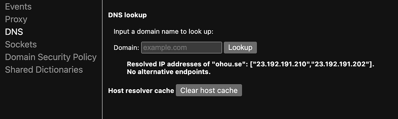 chrome ๋ธ๋ผ์ฐ์ ๋ฅผ ์ฌ์ฉํ๊ณ ์๋ค๋ฉด, ์ฃผ์์ฐฝ์ chrome://net-internals/#dn ๋ฅผ ์น๊ณ ๋ค์ด๊ฐ๋ฉด ๋ธ๋ผ์ฐ์ ์ ์บ์ฑ๋์ด ์๋ ๋๋ฉ์ธ์ IP ์ฃผ์๋ฅผ ํ์ธํ ์ ์์ด์.