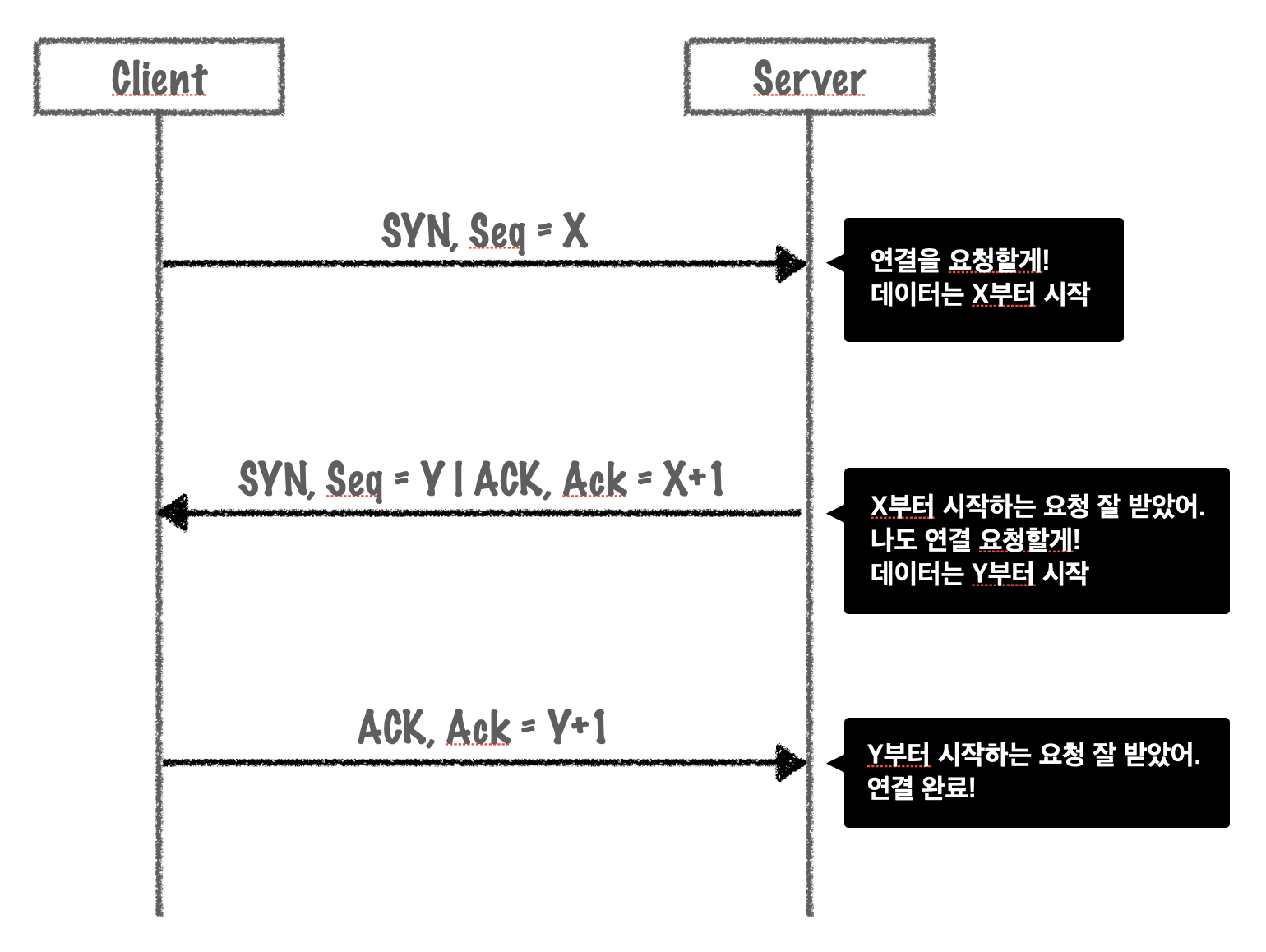 X ๋ถํฐ ์์ํ ๊ฑฐ๋ผ๋ ์ฐ๊ฒฐ ์์ฒญ์ ์ ๋ฐ์๊ณ (ACK), ๋๋ ์ฐ๊ฒฐ ์์ฒญํ๋๋ฐ ๋ฐ์ดํฐ๋ Y๋ถํฐ ์์ํ ๊ฑฐ SYN)๋ผ๋ ๋ป์ ๋๋ค.
