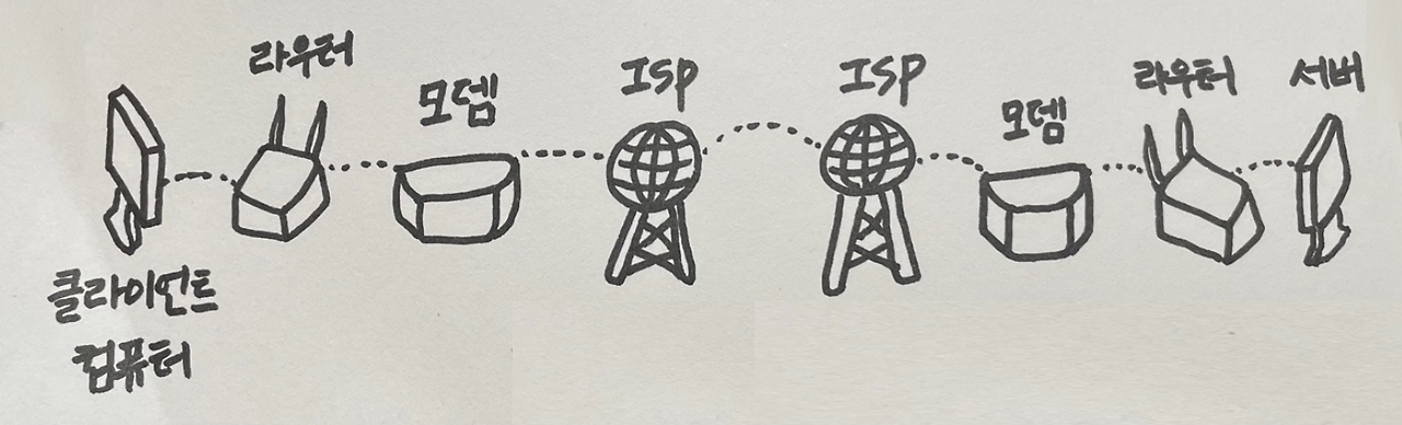 ์ง๊ธ๊น์ง์ ๋ด์ฉ์ ์์ฝํด๋ณด๋ฉด, ๋ด ์ปดํจํฐ์์ ์์ํ ์์ฒญ์ด "๋ผ์ฐํฐ", "๋ชจ๋" ์ด๋ผ๋ ๋ฌผ๋ฆฌ์ ์ฅ์น๋ฅผ ๊ฑฐ์ณ์ ISP(ํต์ ์ฌ)๋ก ์ด๋ํ ๋ค ๋ค๋ฅธ ISP(ํต์ ์ฌ)๋ฅผ ๊ฑฐ์ณ์ ์ญ์์ผ๋ก ๋ค์ ์ ํธ๋ฅผ ๋ณํํ๋ฉด ์๋ฒ ์ปดํจํฐ์ ๋๋ฌํ๊ฒ ๋๋ ๊ฒ์ด์ฃ . ์ด๋ฌํ ๊ณผ์ ์ ํตํด์ ๋ด ์ปดํจํฐ์์ ๋ด๊ฐ ๋๋ฅธ ์ฃผ์์ฐฝ ์ ๋ ฅ ์์ฒญ์ด ์๋ฒ์๊น์ง ๋๋ฌํ๊ฒ ๋ฉ๋๋ค.