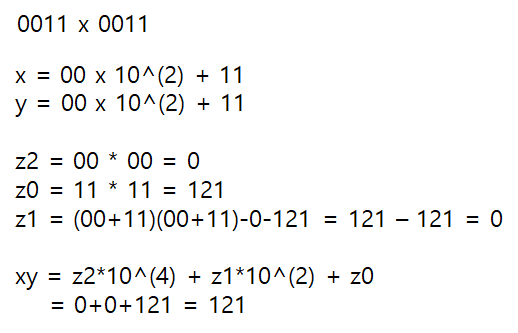 //(a0+a1)*(b0+b1)=(a0*b0)(=z0)+(a1*b0+a0*b1)(=z1)+(a1*b1)(=z2)์ ์๋ฆฌ