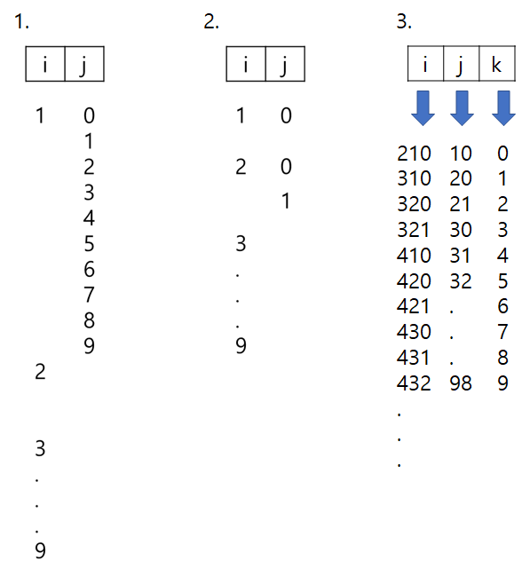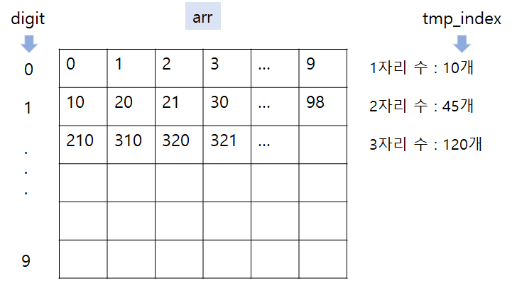 ์๋ ๊ทธ๋ฆผ๊ณผ ๊ฐ์ด digit๋ฅผ ๋๋ ค๊ฐ๋ฉด์ ๊ฐ digit(์๋ฆฟ์)๋ง๋ค 1~9๊น์ง ๋๋ฉด์ ํ์ฌ ์๋ฆฟ์๋ณด๋ค ํ ์๋ฆฌ ๋ฎ์ ์๋ฆฌ์ ๊ฐ์ํ๋ ์๋ฅผ ์ํํ๋ค. ์ํํ๋ ์์ ๊ฐ์ฅ ๋์ ์๋ฆฌ ์๊ฐ ํ์ฌ ๋๋ index๋ณด๋ค ๋ฎ์ผ๋ฉด ๋ํด์ ์ซ์๋ก ๋ง๋ ๋ค. (3์๋ฆฌ ๊ฐ์ํ๋ ์๋ฅผ ๋ง๋ค ๋, index๊ฐ 2๋ฉด 2์๋ฆฌ ๊ฐ์ํ๋ ์ ์ค์ 10์ด ๊ฐ์ฅ ๋์ ์๋ฆฌ ์๊ฐ 1์ด๋ฏ๋ก 2์ ํฉ์ณ์ง ์ ์๋ค.)