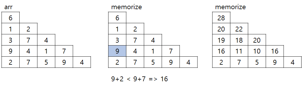 ๋๋ฒ์งธ ๊ทธ๋ฆผ์ ํ์๋ ๊ฒ์ฒ๋ผ ๋ง์ง๋ง ์ค์ด ์๋ ์์น๋ฅผ ์กฐ์ฌํ ๋์๋ ์๋์ชฝ(2)๊ณผ ์ค๋ฅธ์ชฝ ์๋(7)๋ฅผ ์กฐ์ฌํด์ ์กด์ฌํ ์ ์๋ ๋ ํฐ ์๋ฅผ ์ ์ฅํ๋ค. ์ด๋ฐ์์ผ๋ก ์ฌ๊ท๋ฅผ ํ๊ณ ๋ค์ด๊ฐ๋ฉด ๋ง์ง๋ง ๊ทธ๋ฆผ์ memorize ๋ฐฐ์ด์ด ์์ฑ๋๊ณ ๊ฐ์ฅ ์ฒซ๋ฒ์งธ ๊ฐ์ด ๊ฒฐ๊ณผ์ด๋ค.