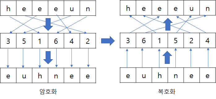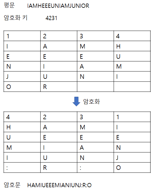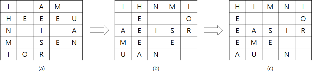 "I AM HEEEUN I AM SENIOR"๋ผ๋ ๋ฌธ์ฅ์ ์ ์น ์ํธ๋ก ์ํธํ ์ํฌ ๋, ์ฃผ์ด์ง ๋ฌธ์ ์งํฉ์ ๋ํด์ ์๋ฆฌ๋ฅผ ๋ฐ๊พธ์ด์ฃผ๋ฉด ๋๋ค. (a) => (b)๋ก ์ํธํ ํ ๋๋ ์๋ฌธ์ ์ธ๋ก๋ก ์ฝ๋ ๋ฐฉ์์ผ๋ก ์๋ฆฌ๋ฅผ ๋ฐ๊พธ์ด ์ฃผ์๋ค. (b)=>(c)๋ก ์ํธํ ํ ๋๋ ์ด์ ์๋ฆฌ๋ฅผ 2๊ฐ์ฉ ์ง์ง์ด ์๋ก ๋ฐ๊พธ์ด์ฃผ๋ ๋ฐฉ์์ผ๋ก ์๋ฆฌ๋ฅผ ๋ฐ๊พธ์ด ์ฃผ์๋ค. ์ด๋ ๊ฒ ์ฌ๋ฌ ๋ฒ์ ์ ์น ์ํธํ ๋ฐฉ์์ ๊ฑฐ์ณ์ ์ต์ข ์ํธ๋ฌธ์ ๋ง๋ค์ด๋ด๋ ๋๋ค.
