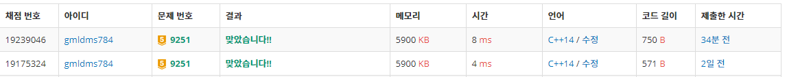 ์ฒซ์งธ ์ค์ ์ ๋ ฅ์ผ๋ก ์ฃผ์ด์ง ๋ ๋ฌธ์์ด์ LCS์ ๊ธธ์ด๋ฅผ ์ถ๋ ฅํ๋ค.