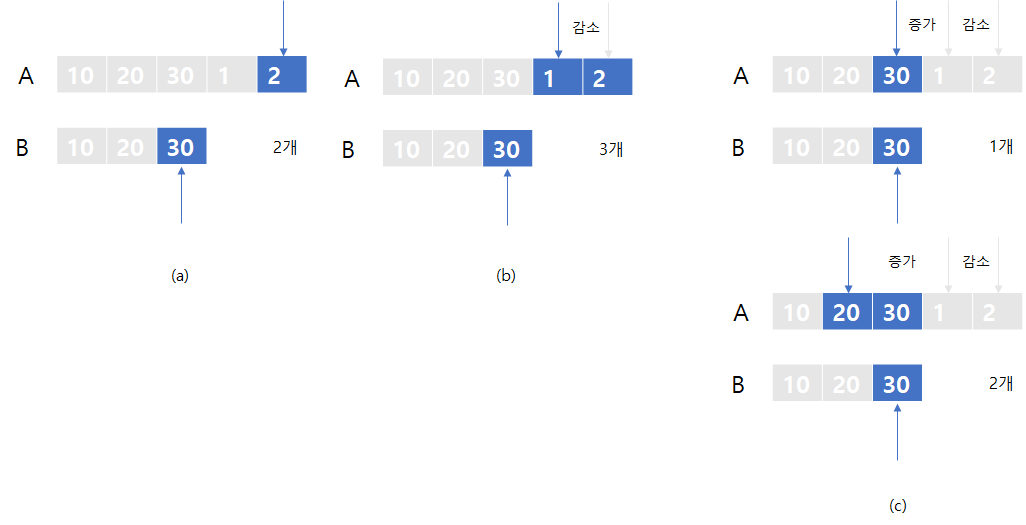 ์ด๋ฅผ ์์์๋ถํฐ ํฌ์ธํฐ๊ฐ ๊ฐ๋ ๊ฒ์ผ๋ก ํํํด๋ณด๋ฉด, ๋ชจ๋ ํฌ์ธํฐ์ ์์น๋ฅผ ์กฐ์ฌํ๋ฉด์ ํ์ฌ ํฌ์ธํฐ ์์น๋ถํฐ A์ ํฌ์ธํฐ๋ฅผ ์์ง์ฌ์ ์ฆ๊ฐ์์ด๋์ ์กฐ์ฌํ๊ณ B์ ํฌ์ธํฐ๋ฅผ ์์ง์ฌ์ ์ฆ๊ฐ์์ด๋์ ์กฐ์ฌํ๋ ์์ผ๋ก ๋ฐ๋ณตํ๋ค.