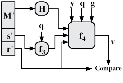 w = s^-1 mod q u1 = (H(M)w) mod q u2 = rw mod q v = ((g^u1*y^u2) mod p ) mod q -