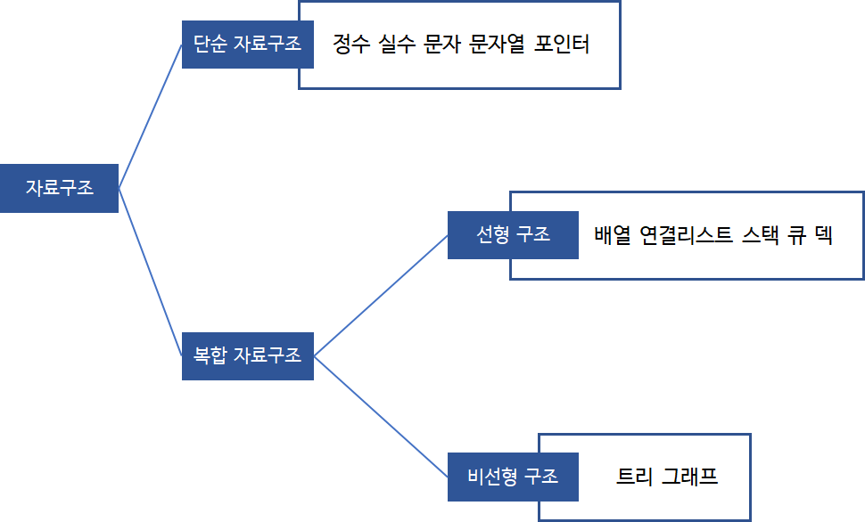 자료구조는 먼저 단순 자료구조와 복합 자료구조로 구분되고, 복합 자료구조에는 선형 구조와 비선형 구조가 있다. 순차적으로 살펴보자.